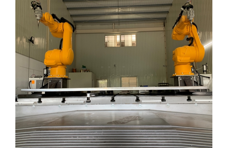 1:荷重150Kg,工作半徑2000mm,搭配24000萬轉可自動換刀主軸,進行複合式材質雕刻,流程說明,將代木素材顧並,進行雕刻.